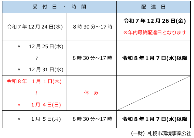 令和7年度 年末年始のプリペイド袋の配達について、下記のとおりご案内いたします。